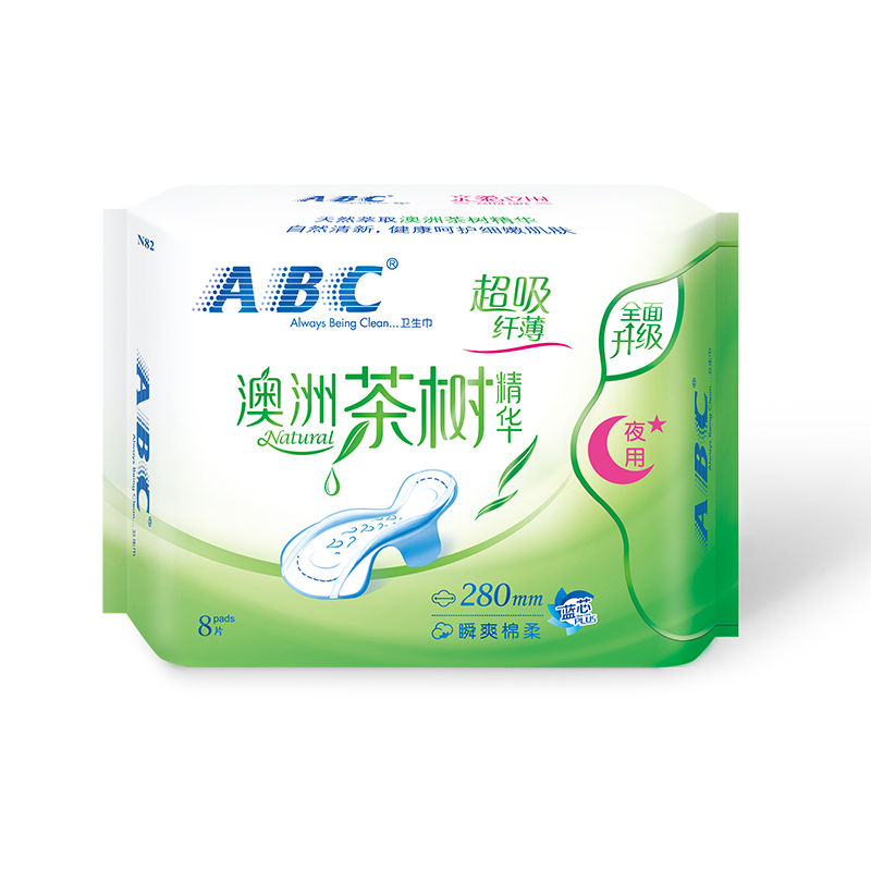 ABC Tea Tree Essence Sanitary Napkins Feminine slim night dosage Multi-web sensation cotton soft surface 8 sheets 280mm whole box batch N82-Taobao