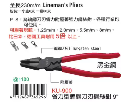 Taiwan imported original KU-900 FUJIYA FUJIYA labor-saving tungsten steel blade pliers 9 inch