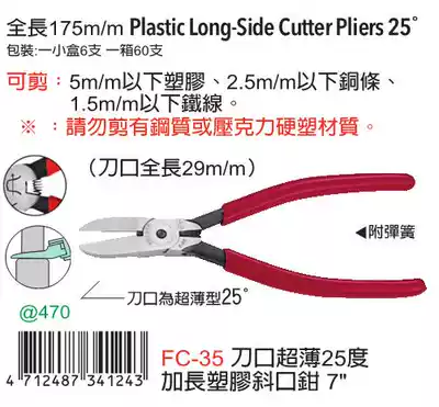 Taiwan imported original FC-35 FUJIYA extended plastic diagonal pliers 7 inch knife edge ultra-thin
