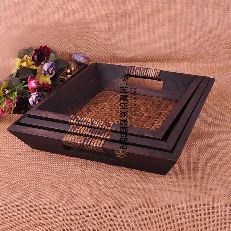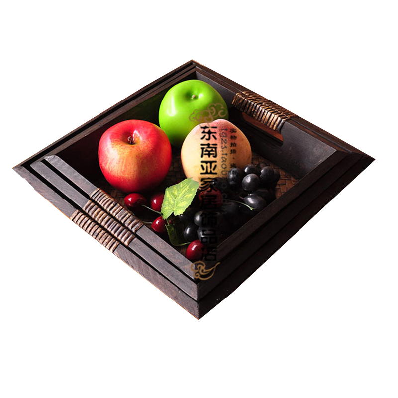 Thai craft gift pendulum decoration solid wood bamboo woven with special fruit tray Three sets of rattan bricked fruit tray wooden fruit tray