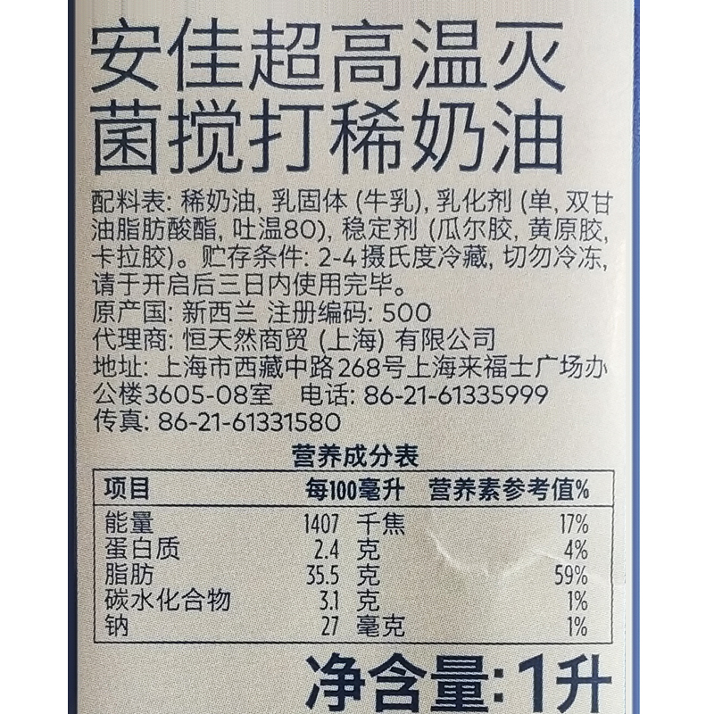 Anja Light Milk Oil 1L Home Baking Cake Framed Flowers Animal Fresh Cream Imported Dilute Cream Egg Tart Special 1 Liter