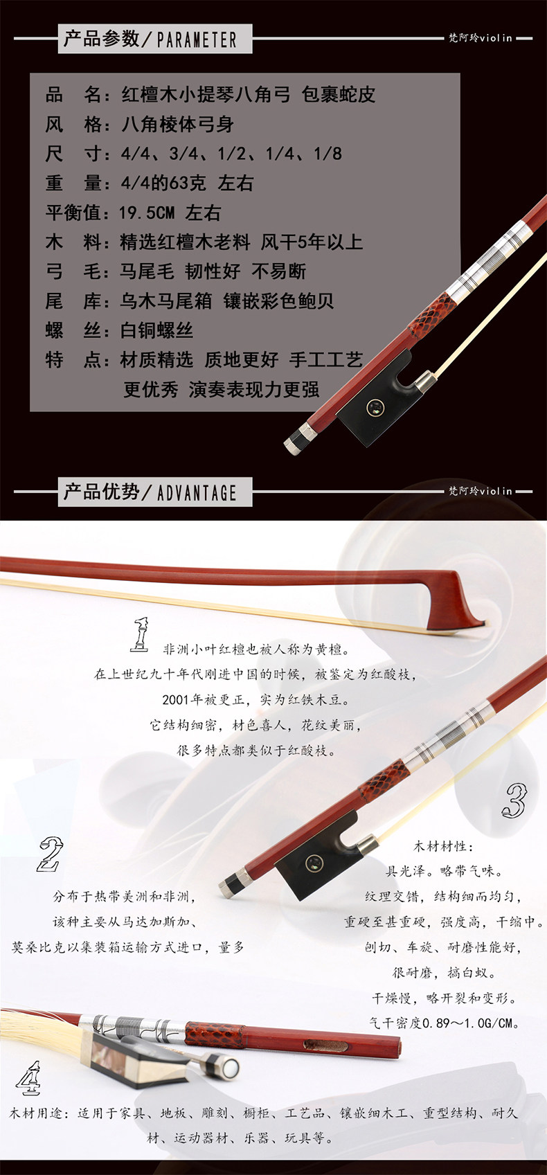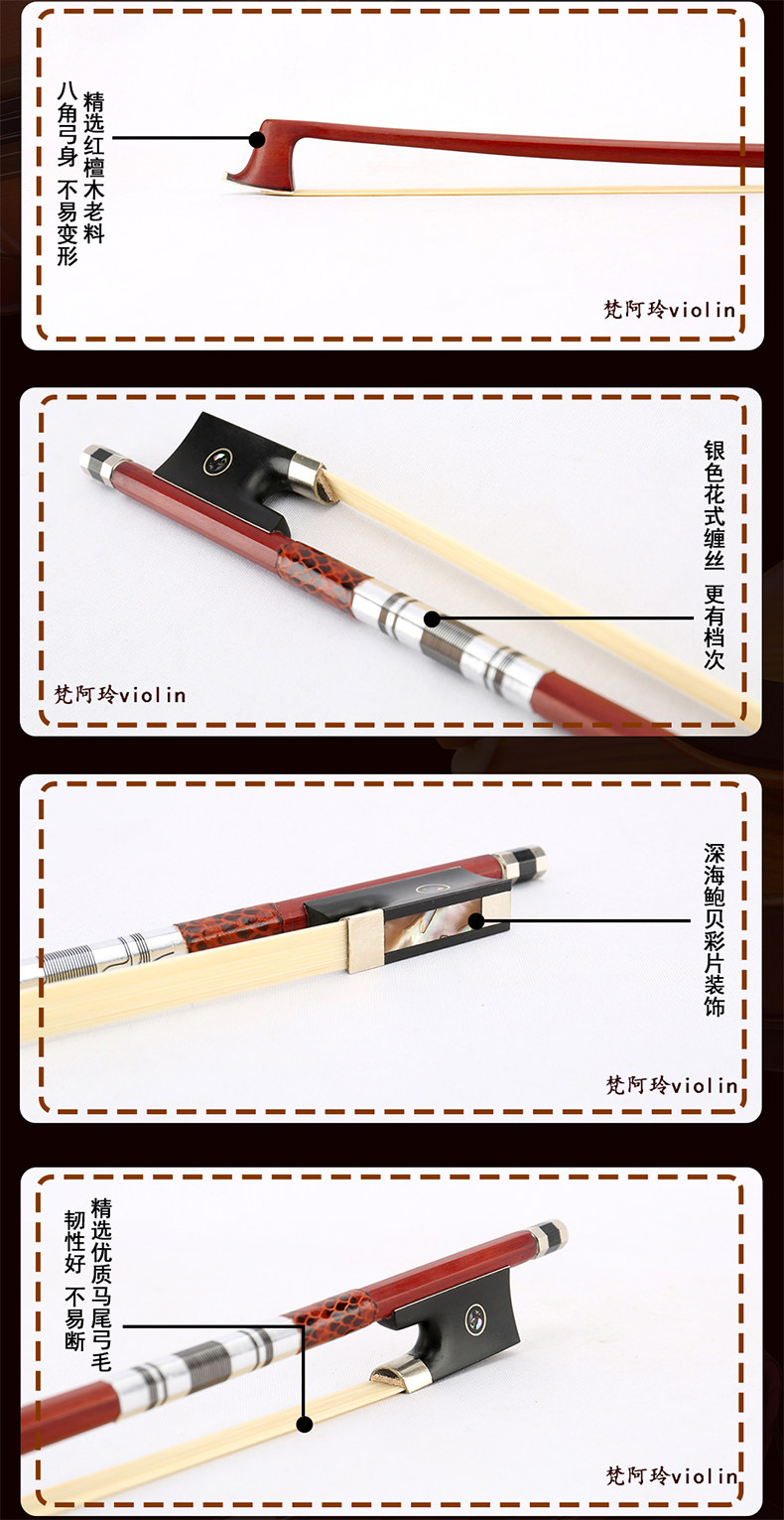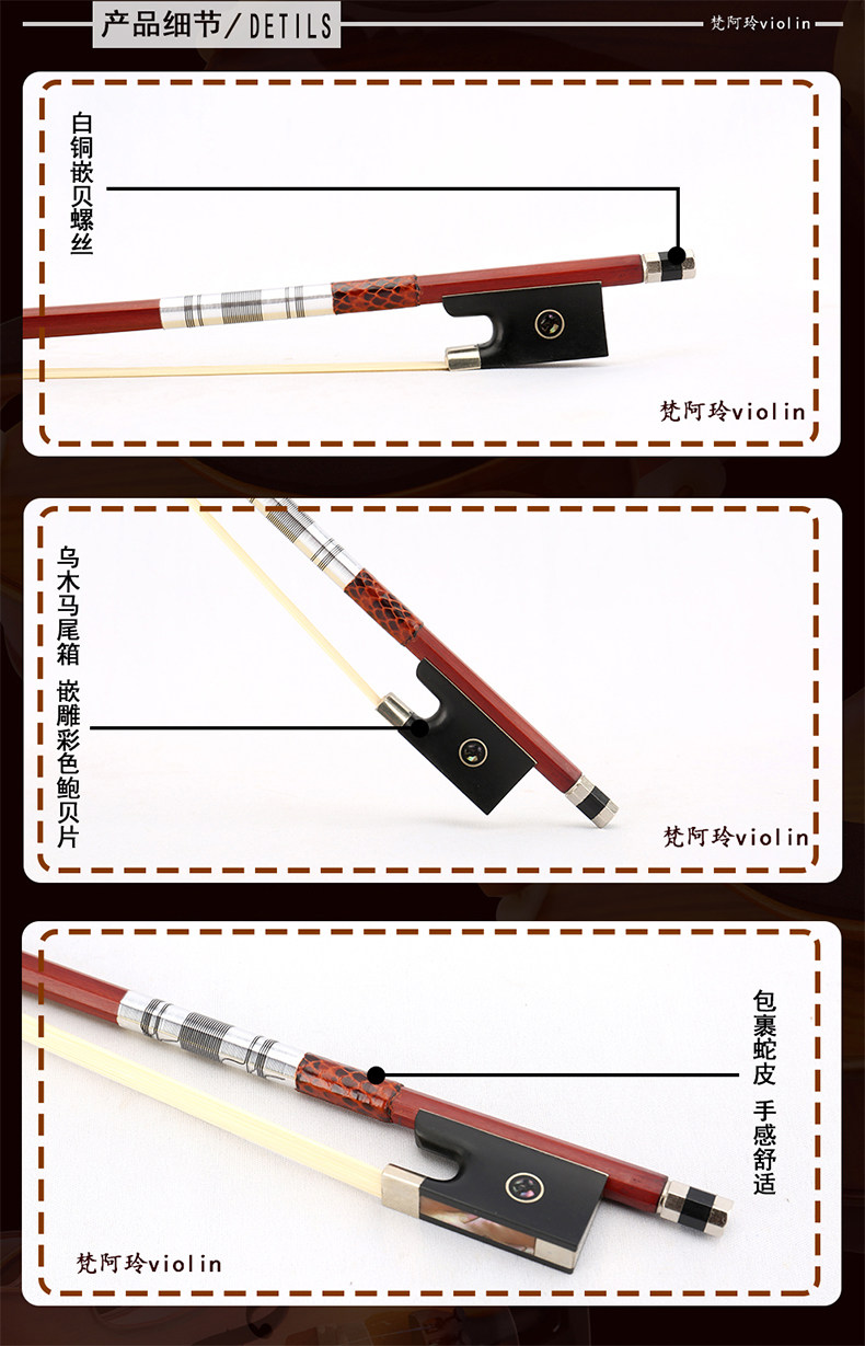 Old material Red sandalwood violin bow playing grade Real horsetail hair snakeskin package Copper color shell material hard feel good