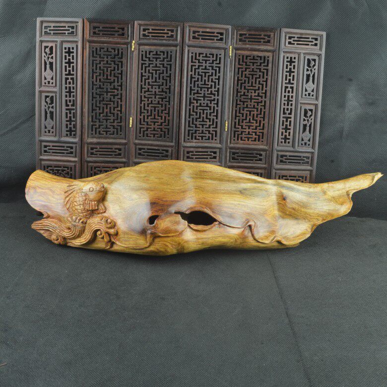Old wood Vietnamese yellow pear carp lotus wood carving carp Yue Longmen Mahogany home entrance root carving ornaments hand carving