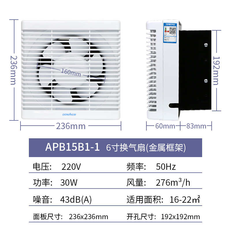 Positive Wild Exhaust Fan 6 Inch Dressing Room Semi-Plastic Square Shutter Wall Type Kitchen Powerful Static Ventilator APB15B1
