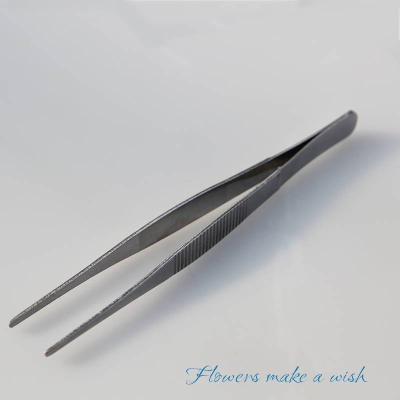A pair of tweezers (16cm) stick a 10 green wire a handle of 50 or so 5cm of mud plug one dollar, five scissors a piece of flower mud, one piece of flower (only sold white ) 7cm