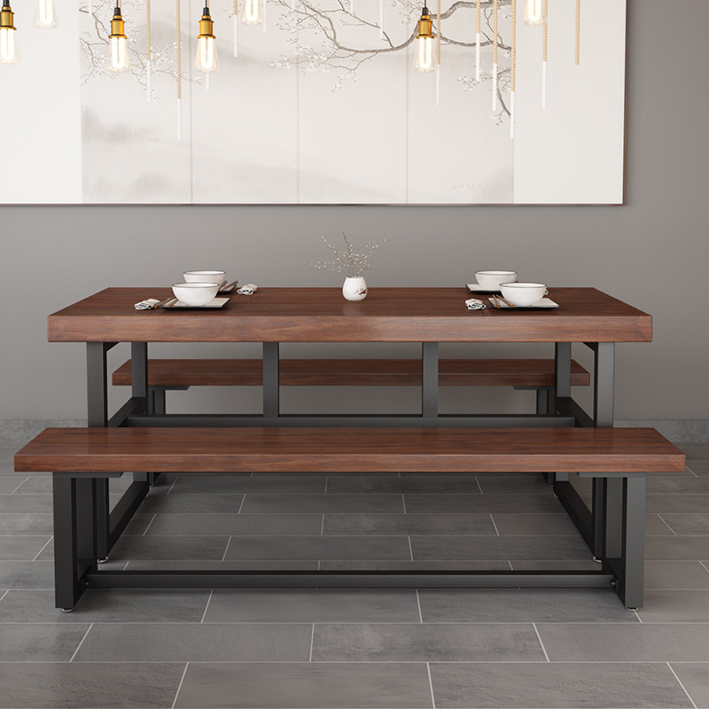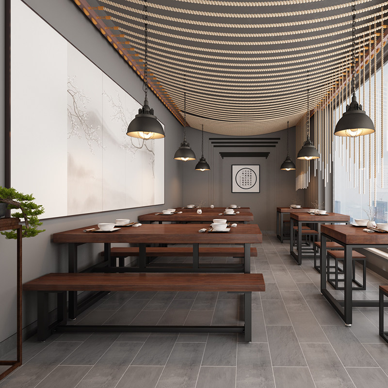 Modern Chinese simple noodle restaurant dining table and chair combination Rectangular wrought iron solid wood long table Commercial one table two stools 1039