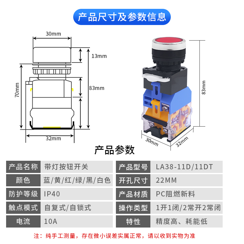 With light button LA38-11D 11DT 203 209B with light self-reset self-locking button switch opening 22MM