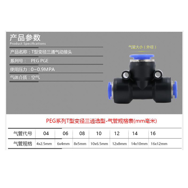 Pneumatic quick connector PEG12-10 Variable diameter T-type three-way quick plug hose PEG8mm variable 6 trachea quick connect accessories