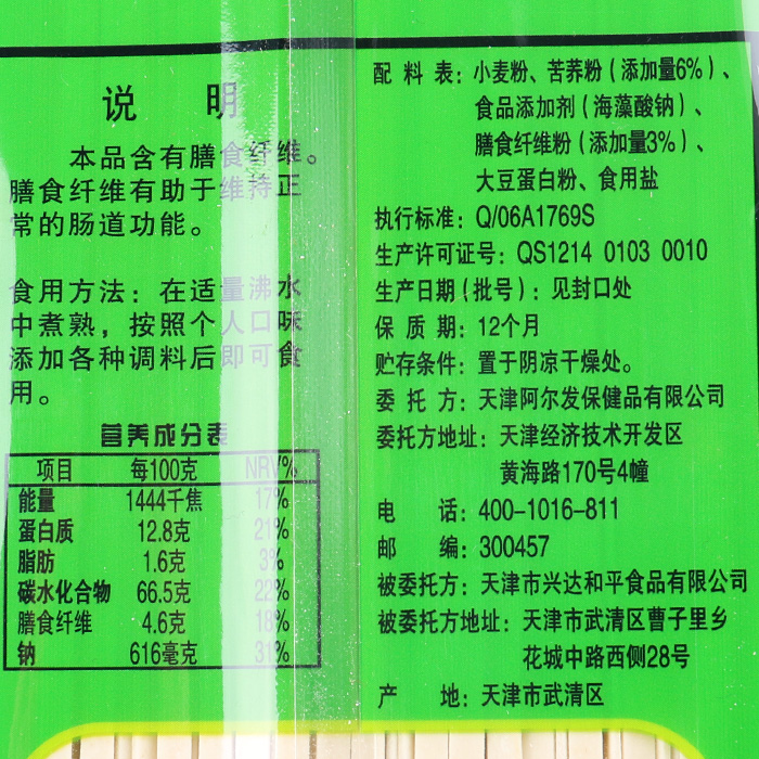 Wheat Flour Tartary Buckwheat Flour (Addition 6%) Food Additive (Sodium Alginate) Dietary Fiber Powder (Addition 3%) Soy Protein Powder Edible Salt