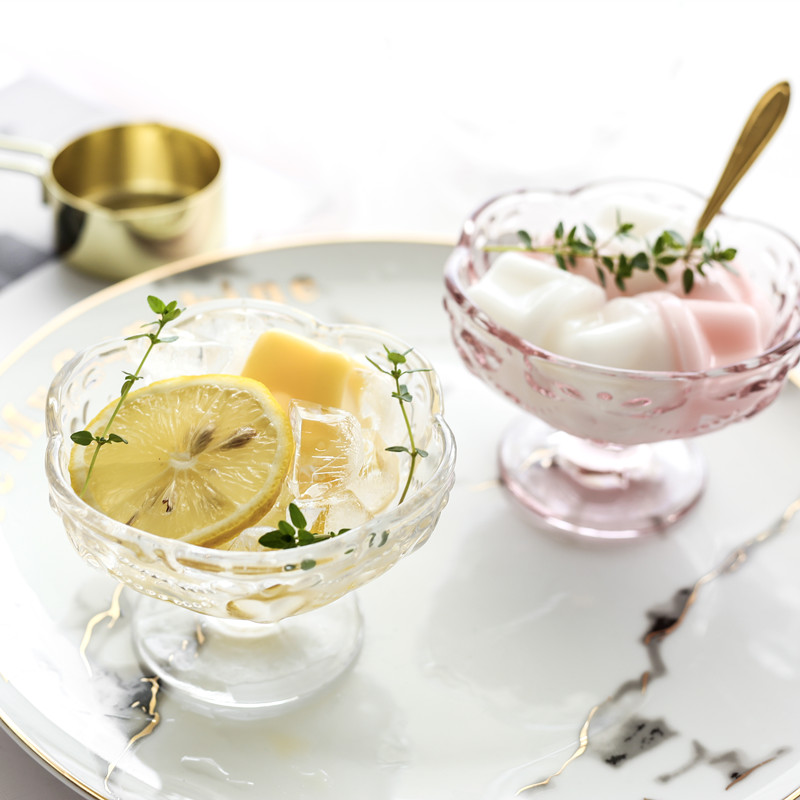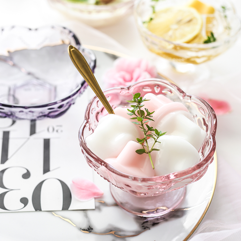 Pink ice cream cup Transparent ice cream cup Pink peach glass plate Pink ice cream cup Golden cherry spoon Transparent ice cream cup Golden cherry spoon Purple petal ice cream cup 150ml Golden spoon powder