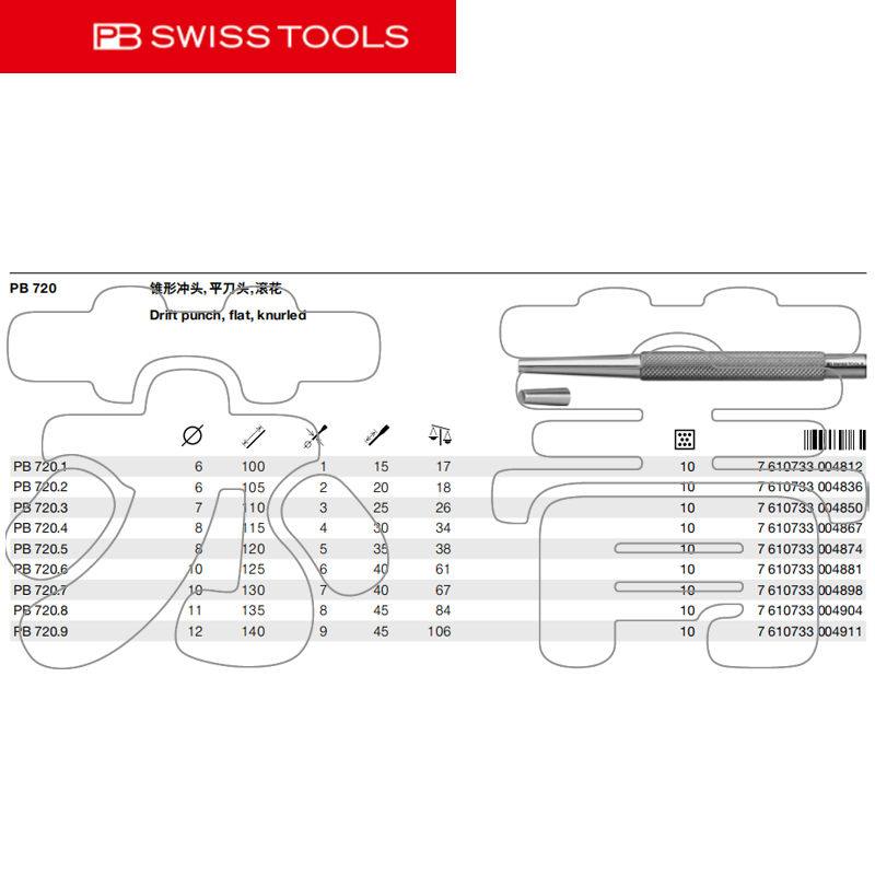 Original Swiss PB SWISS TOOLS Knurled Flat Tip Tapered Punch PB 720 Series for Mechanics