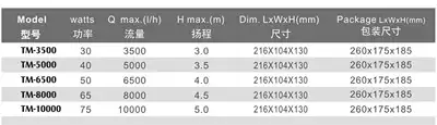 TM-3500 30 watts 3 5 tons 3 meters TM-5000 40 watts 5 tons 3 5 meters TM-6500 50 watts 6 5 tons 4 meters TM-
