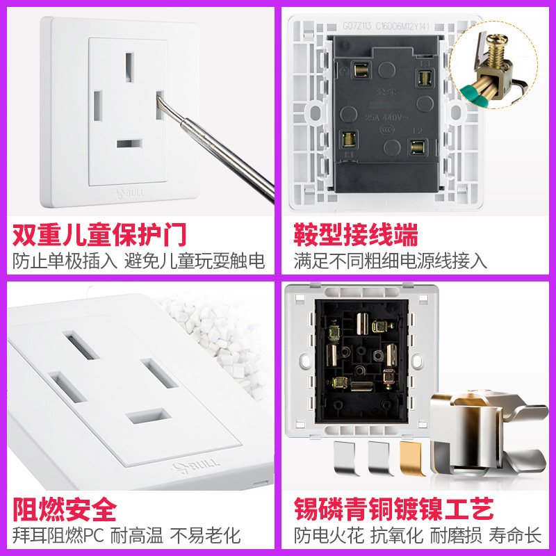 Bull 25 amp air conditioner three-phase four-wire panel concealed 380v four-hole 25a 3-phase electric 4-wire 86-type industrial socket