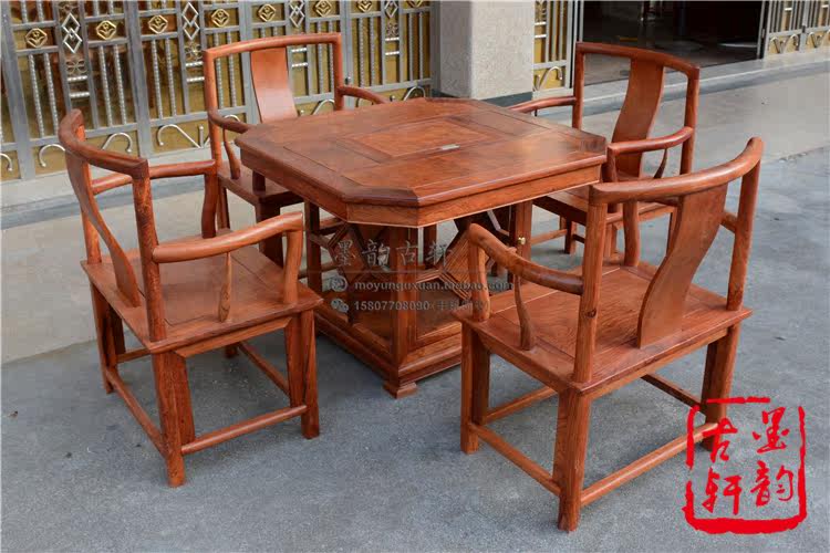 Burmese rosewood square tea table Daguo red sandalwood tea table Solid wood Kung Fu tea table Mahogany dining table five-piece set