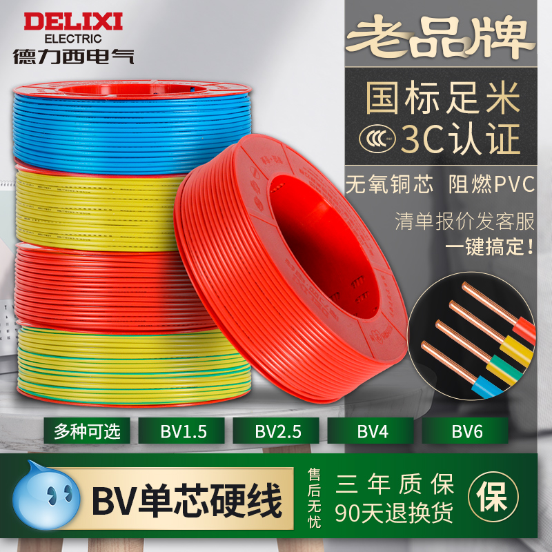 Delixi wire and cable household national standard pure copper core BV1 5 2 5 4 6 square single strand hard wire home improvement