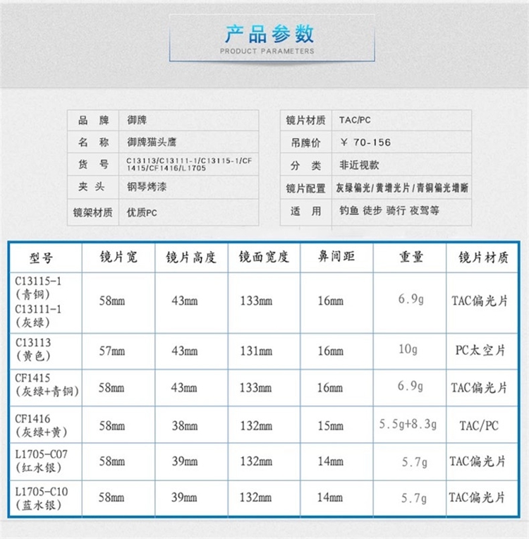 Single-pay clip sheet Bronze Gain (suitable for sunny days) Single-pay laminated sheet grey green (suitable for large sun) Double Pay suit grey green yellow sheet (delivery box) Single pay yellow sheet brightening (suitable for twilight and night fishing) Single pay (