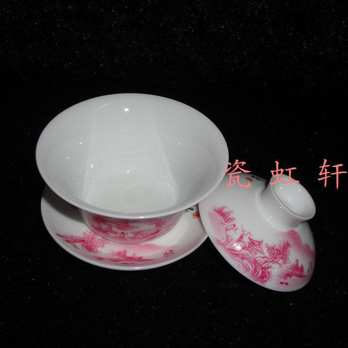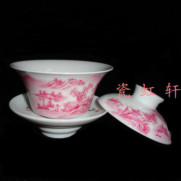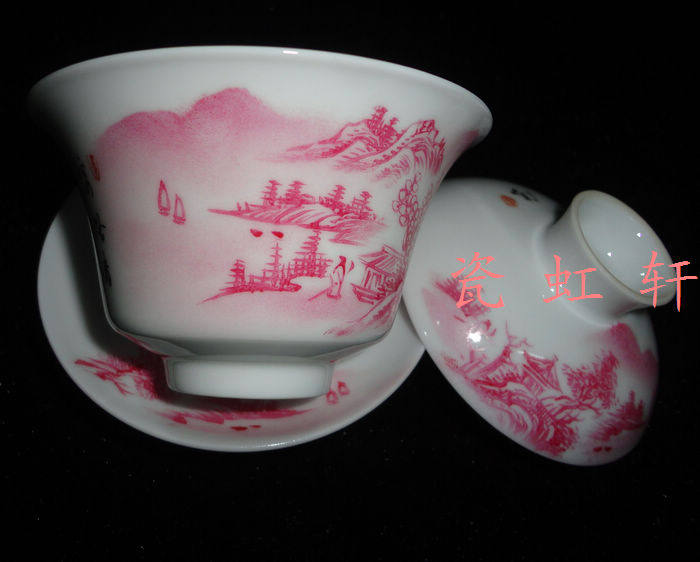 Jingdezhen Cultural Revolution Factory Porcelain Hand-painted Agate Red Landscape Covered Bowl Covered Cup Cultural Revolution Collection Special Offer