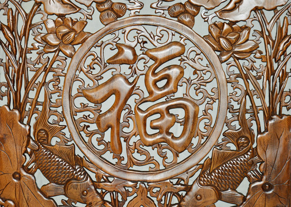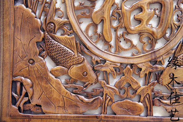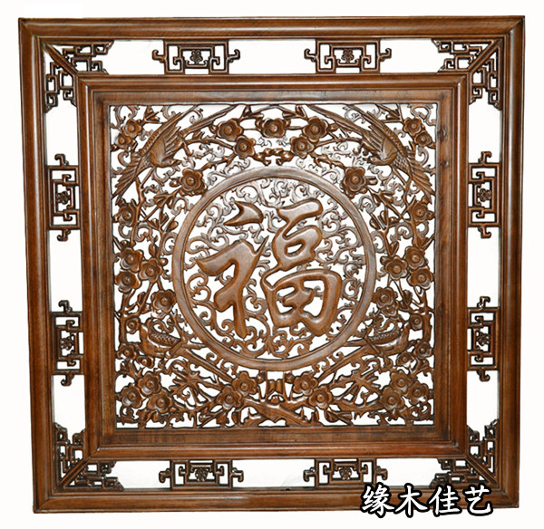 Dongyang wood carving Fu word pendant Camphor wood carving square wall hanging Chinese wall decoration double fish blessing 1 meter