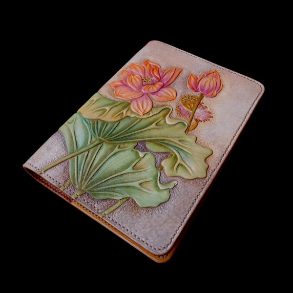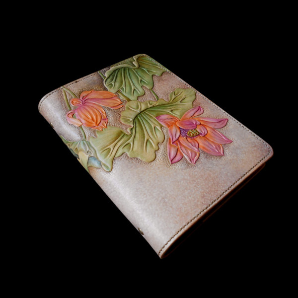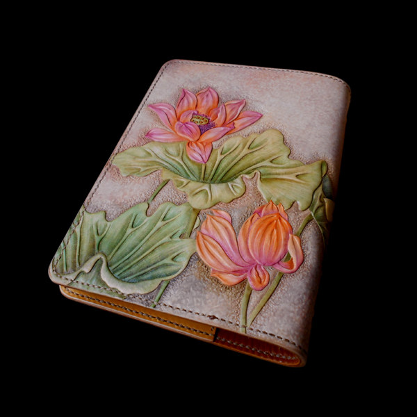 Handmade Genuine Leather Women Bag Men's Bag Gift Custom Leather Carvings Lotus A5 Six-hole Notebook