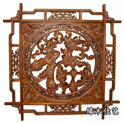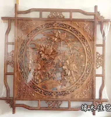 Dongyang wood carving pendant square camphor wood carving lucky character peony flower wall hanging background wall decoration 1 meter 3