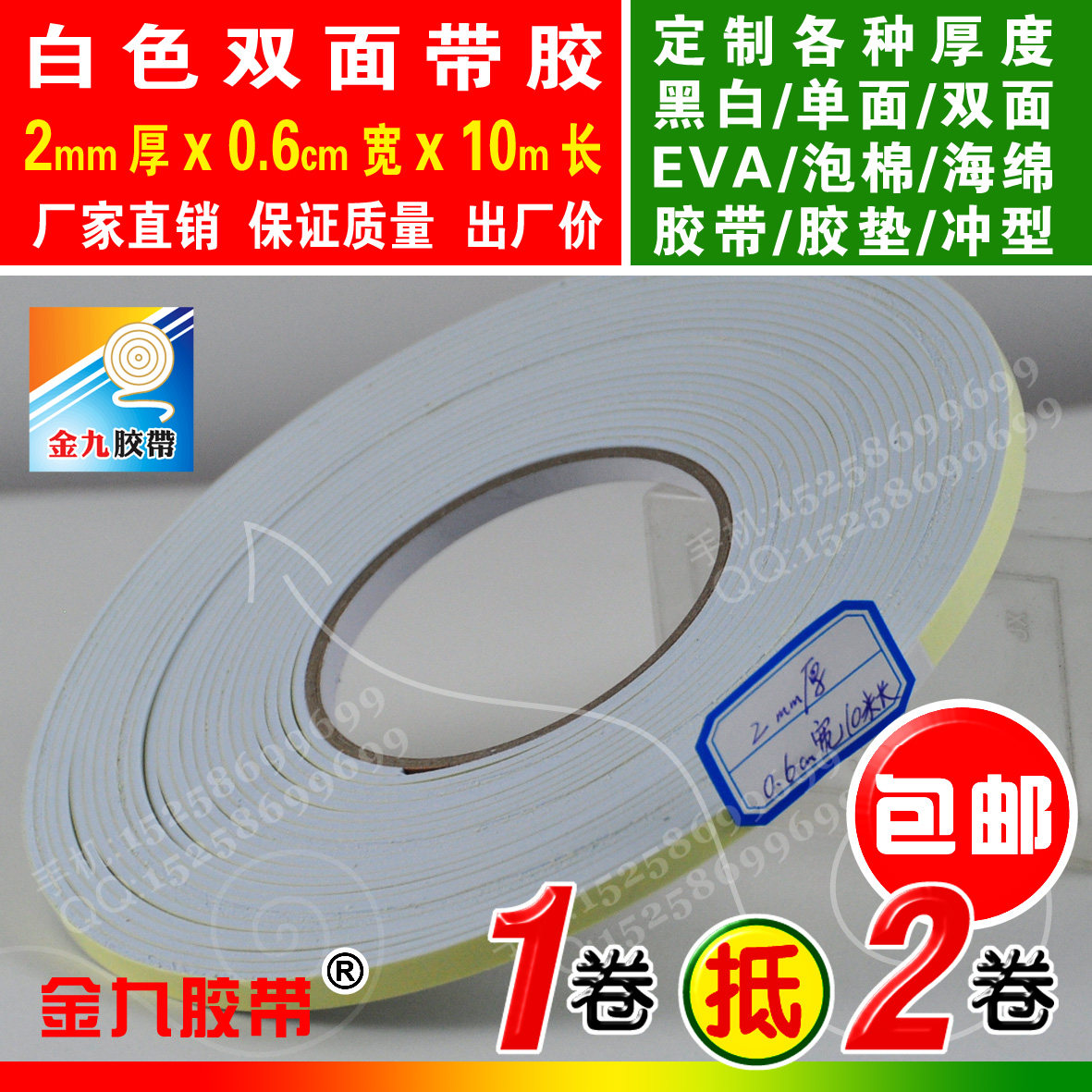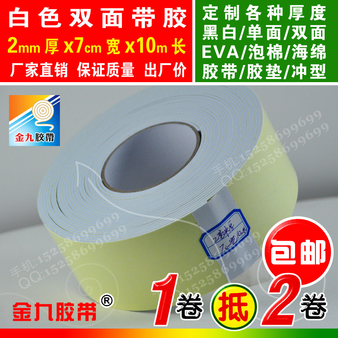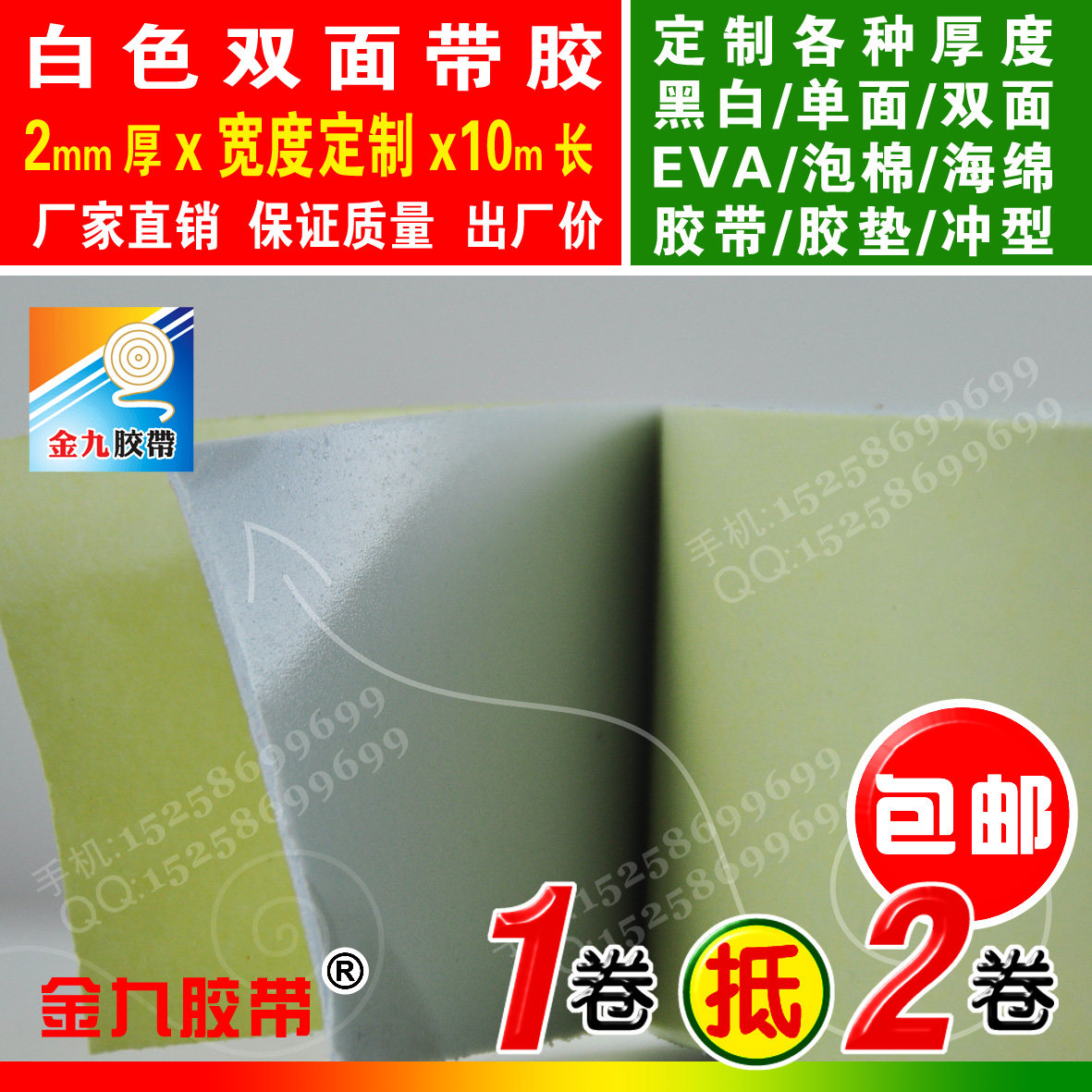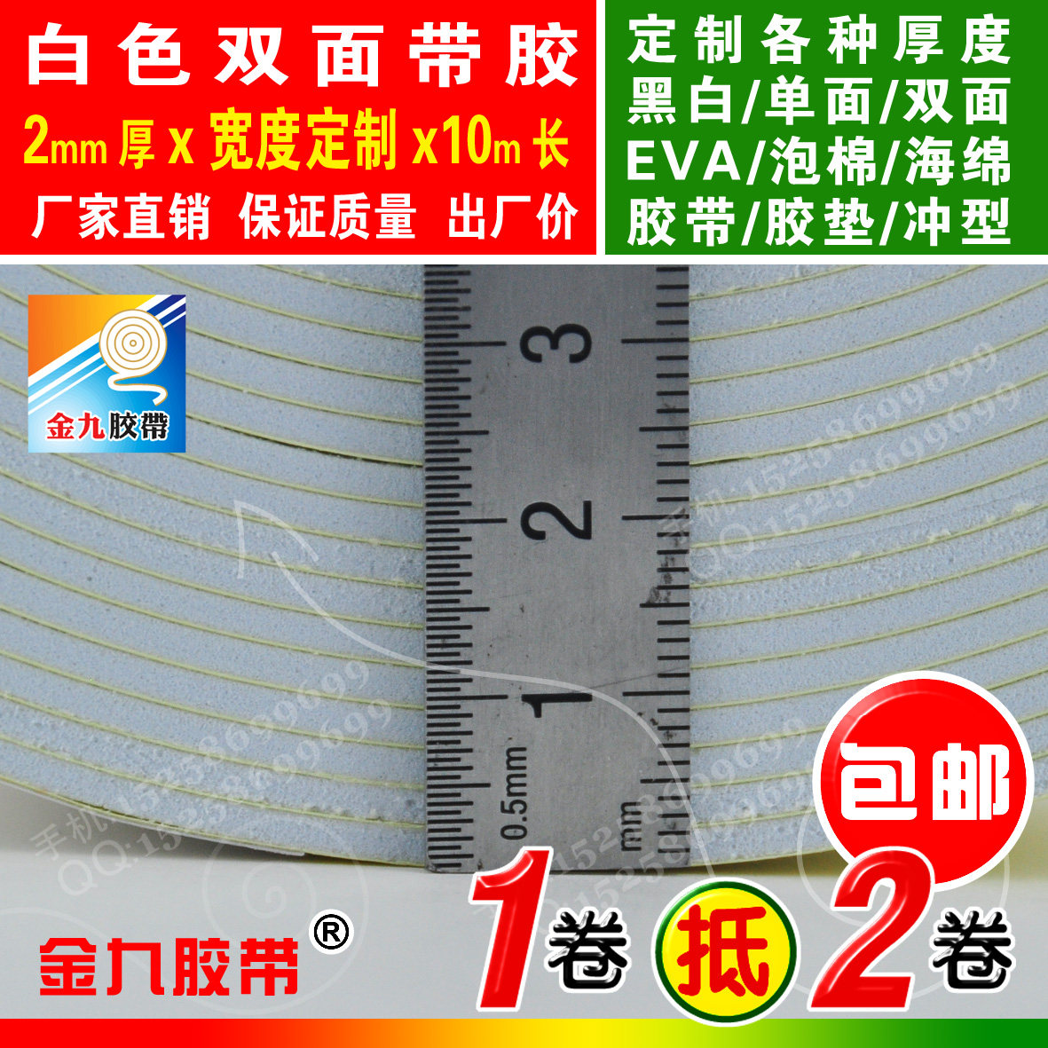 EVA foam sponge glue white double sided with glue shockproof adhesive tape cushion Anti-collision strip width custom 2 mm thick 10 m long