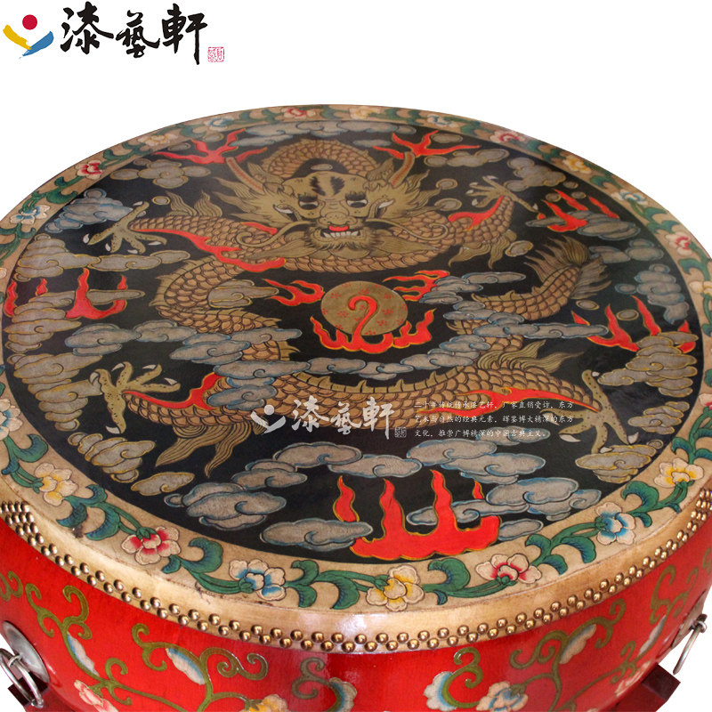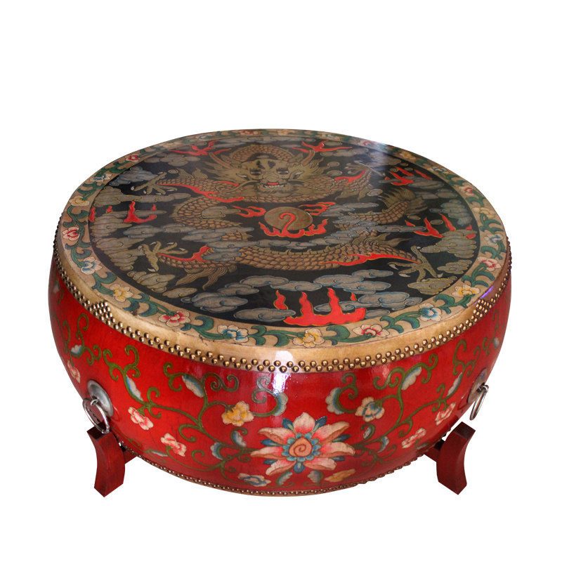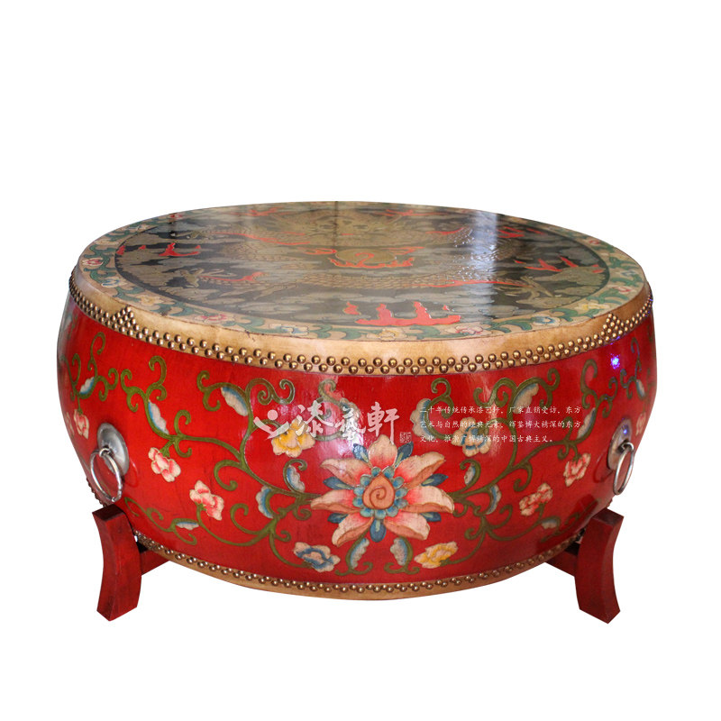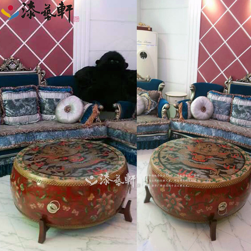 New Chinese creative solid wood round table painted living room cowhide drum coffee table kung fu tea table antique tea table furniture
