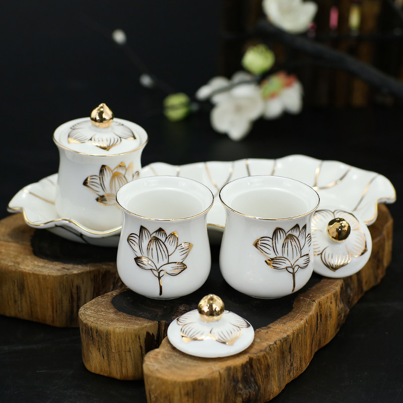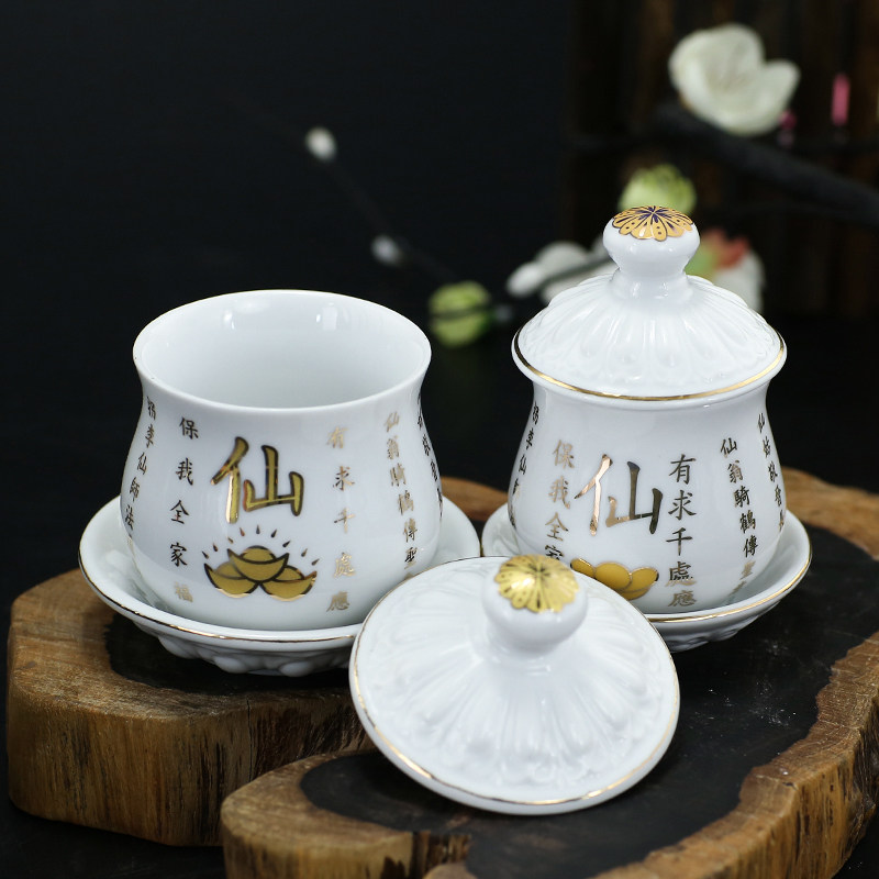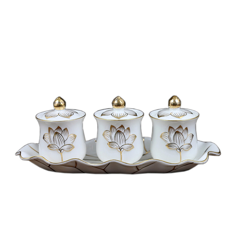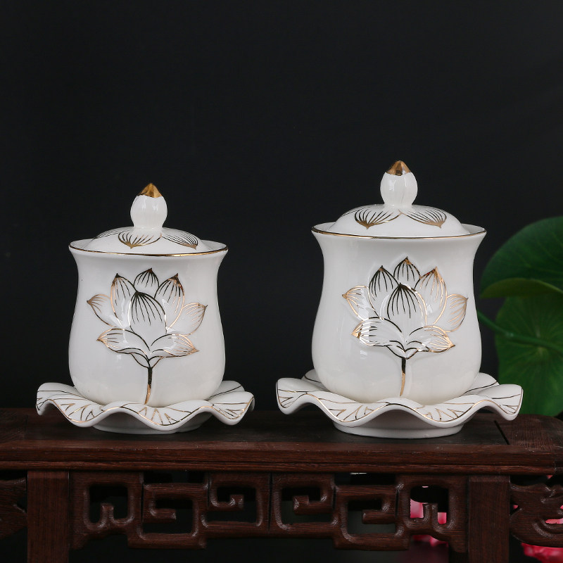 Large Buddhist supplies Holy Water Cup Great Compassion Water Relief White Porcelain Lotus Flower Depicting Gold Water Supply Cup Water Purification Cup for Buddha Offering Cup