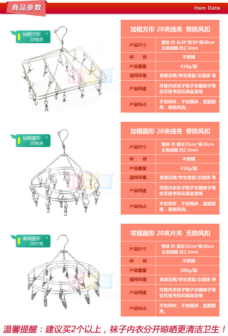 Stainless steel sock rack multi-functional hanger 20 clips double-layer solid windproof hook drying clothes bold double-layer round