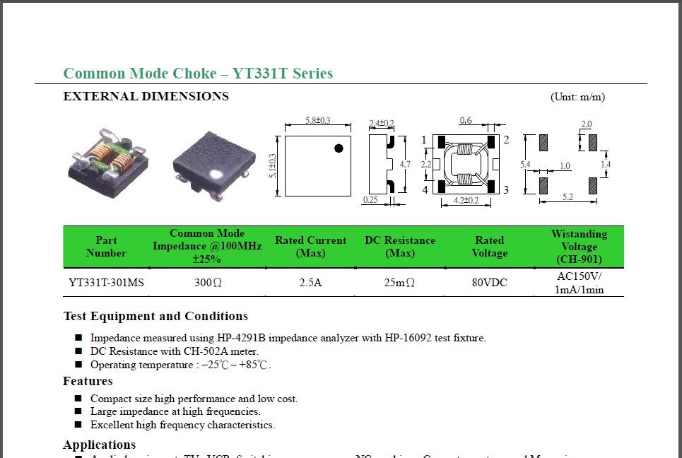 YT331T-301MS SMD Common-mode Inductor 2 5A 80V 300Ω Common-mode filter eliminates noise
