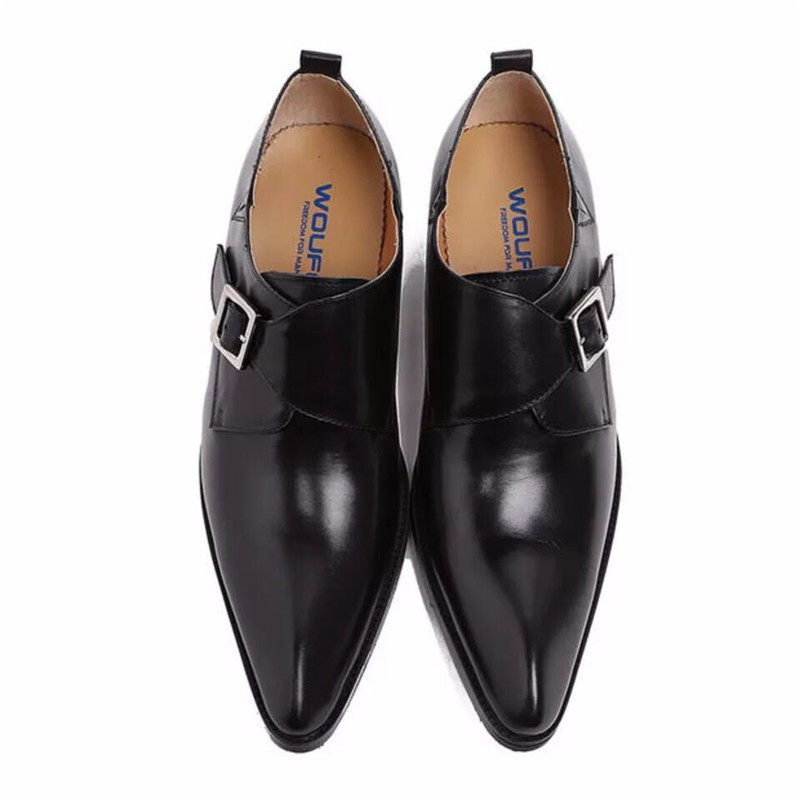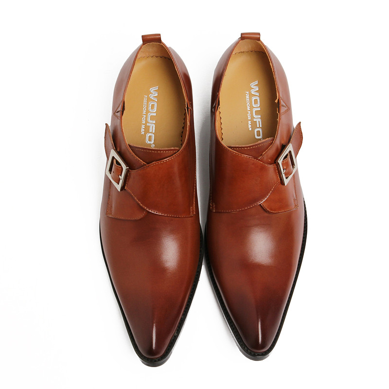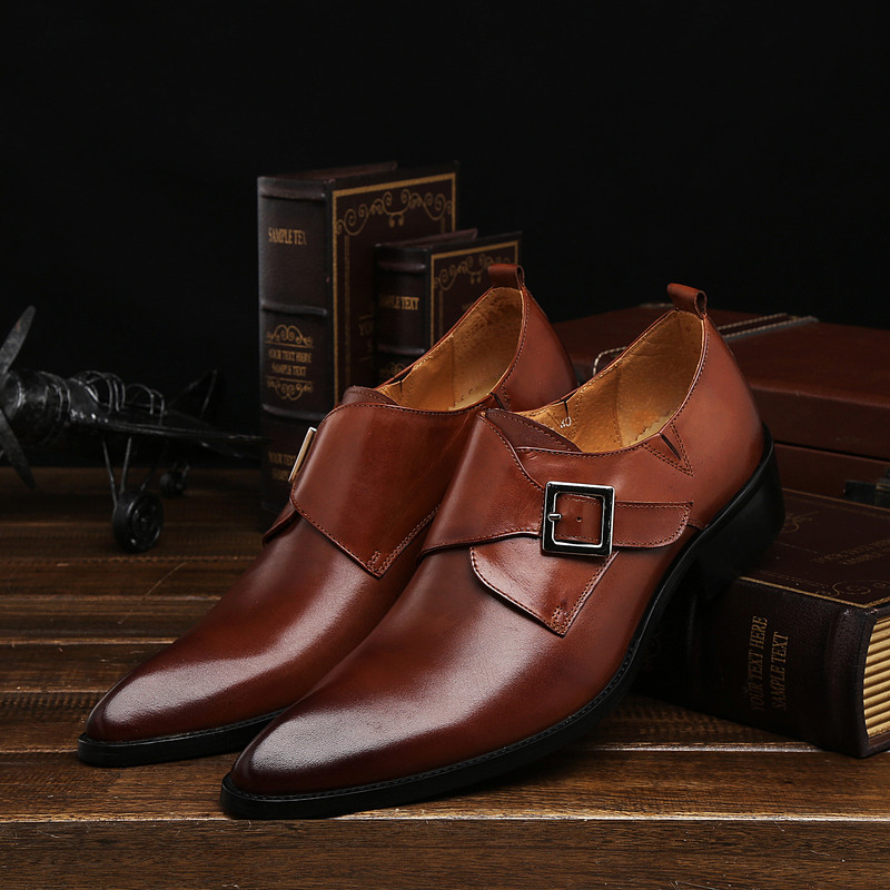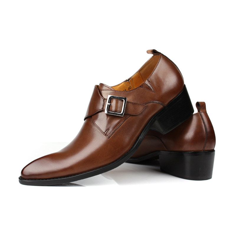 Extra high-heeled leather shoes men's British European version pointed toe business buckle leather brown thick bottom trendy horsebit buckle horseshoe buckle