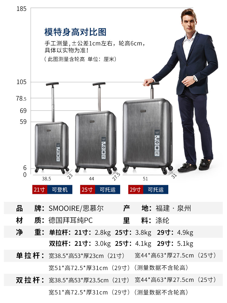 21 inch (width 385 * thick 230 * height 530mm large size ascending chassis short trip must-have) 25 inches (wide 440 * thick 275 * high 630mm7-10 day push