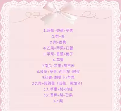 14 Pear pumpkin peach 15 pear peas zucchini 4 Mango Apple sweet potato 5 apple banana Peach 3 pear prunes 7 pumpkin apple sweet corn 8 spinach Apple broccoli pea 9
