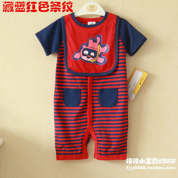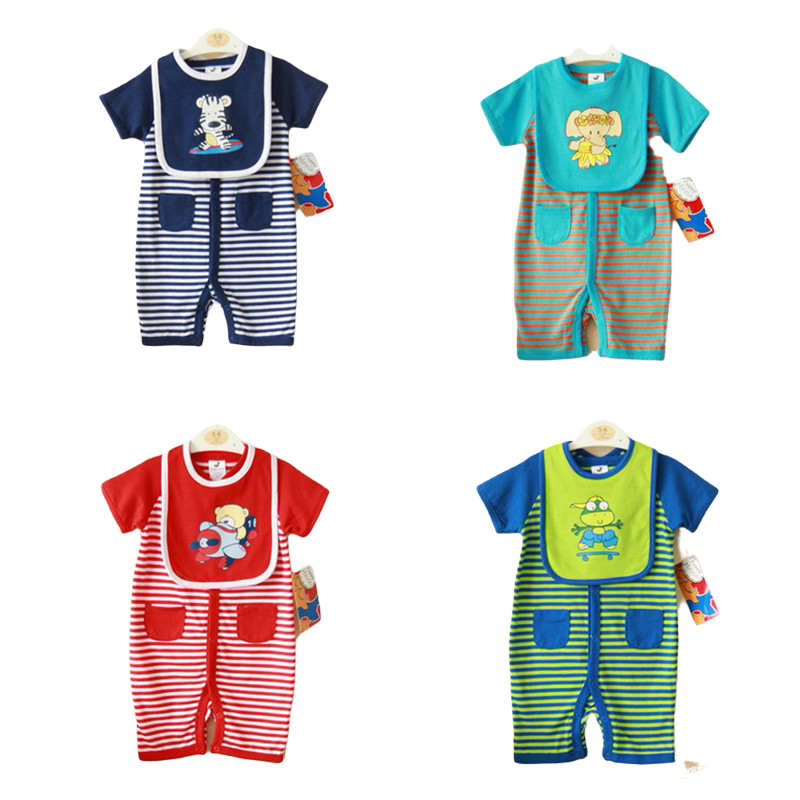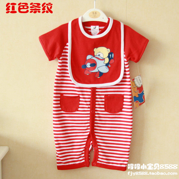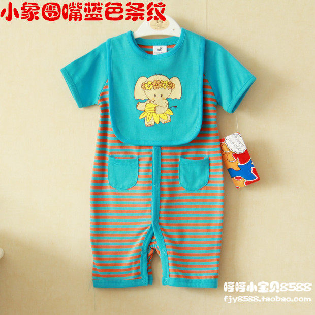 Summer Paragraph Baby Khasehood Baby One-piece Clothing Newborn Cotton Crewback Pure Cotton Striped Short Sleeve Surround Pocket Suit to open crotch