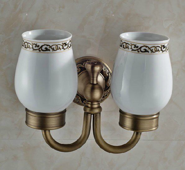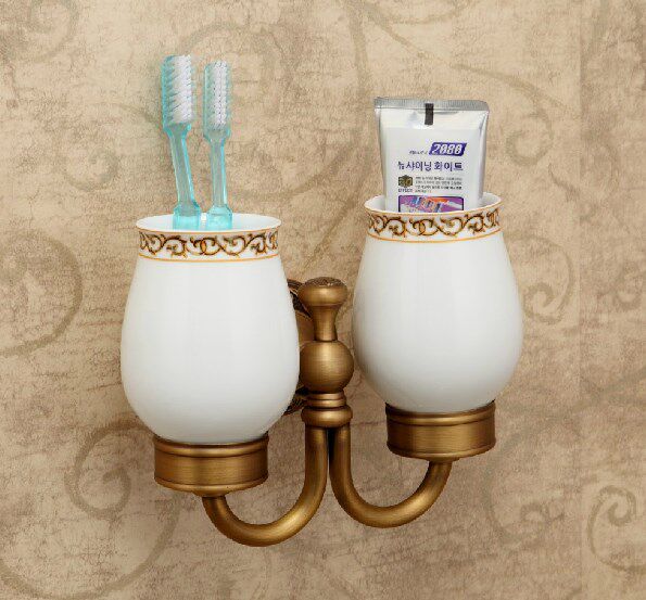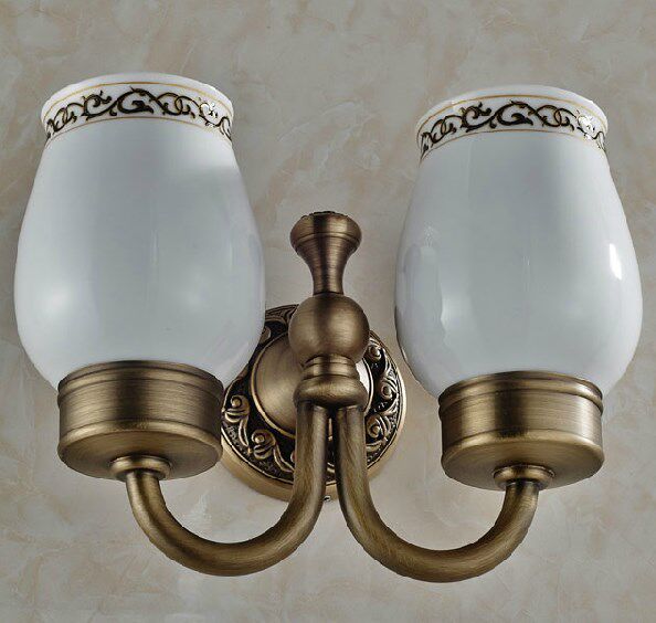 Brass copper antique European creative double cup ceramic cup retro mouthwash cup tooth cup new bathroom products