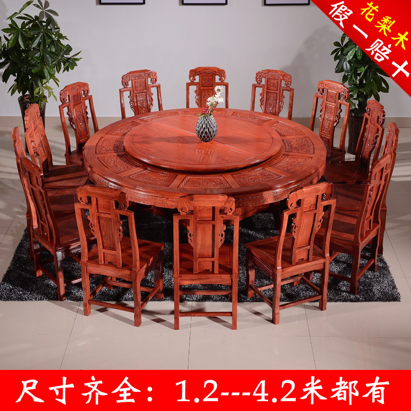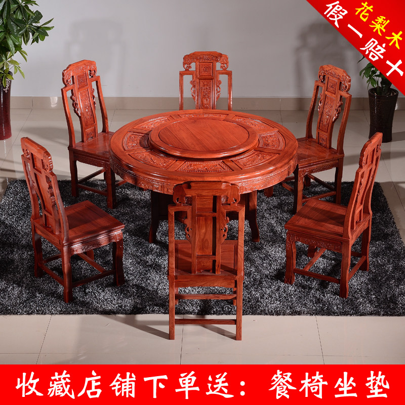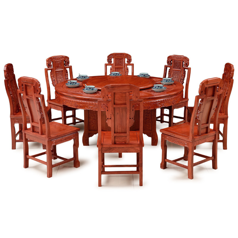 Mahogany dining table round rosewood carved with turntable all solid wood dining table and chair combination Chinese hedgehog rosewood furniture