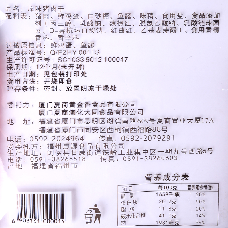 Golden Fragrant Original Pork Dried 130g*2 Xiamen Specialty Pork Dried Charcoal Roasted Pork Dried Individual Small Package
