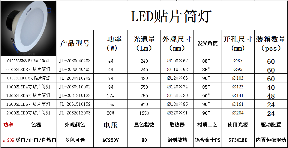 2 5 inches 4W warm white 2 5 inch 4W natural white 2 5 inch 4W positive white 3 inch 4W warm white 3 inch 4W natural white 3 inch 4W positive white 3 5 inch 7W warm white 3