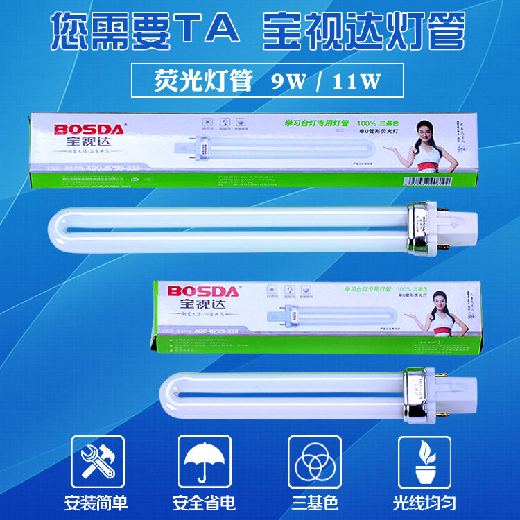 Baoshida desk lamp bath heater single U-shaped fluorescent glass bulb energy-saving eye protection 2 two-pin double-pin lamp 9W 11W