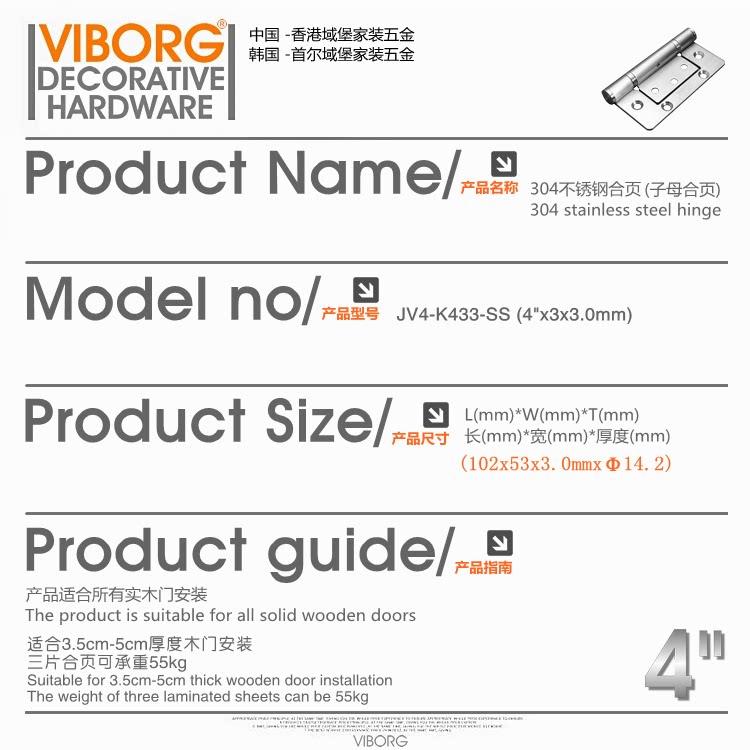 Single price 4 inches suitable for door thickness of 3.5cm ~ 4.5cm with stainless steel screws Monolithic price 5 inches suitable for door thickness of 3.5cm ~ 4.5cm with stainless steel screws