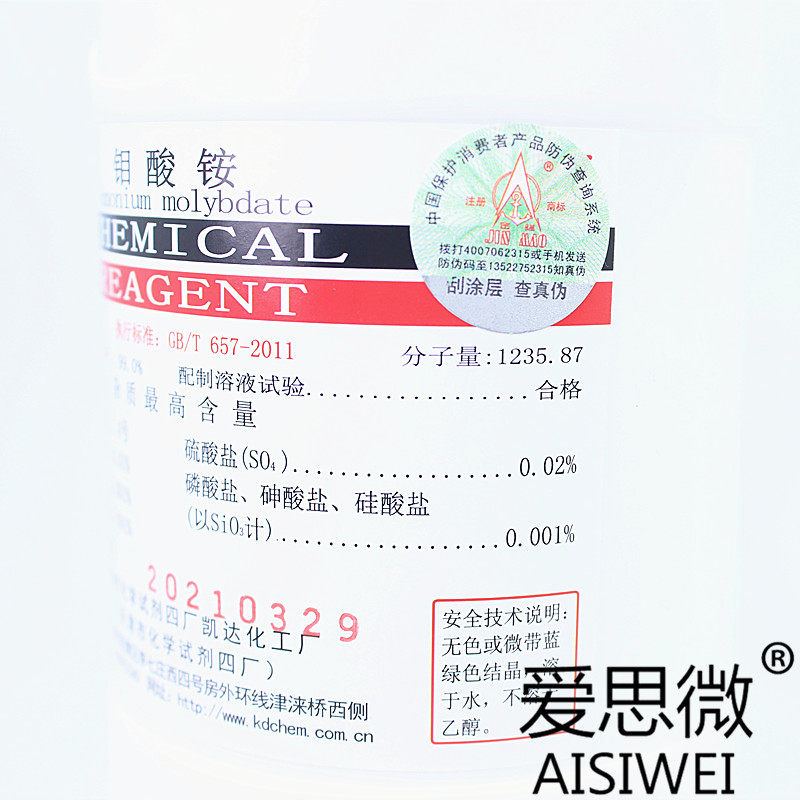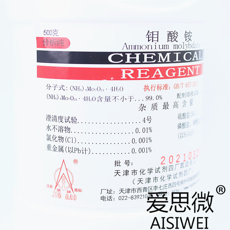 Molybdenum Acid Ammonium Tetrhydration Molybdenum Fertilizer Chemical Reagent Analysis Pure AR500g Tianjin Kaida Chemical Plant Gold Anchor Card