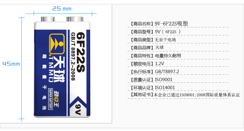 Tianqiu 9V battery 6F22S remote control microphone Wireless microphone Universal meter mercury-free square Chinese packaging