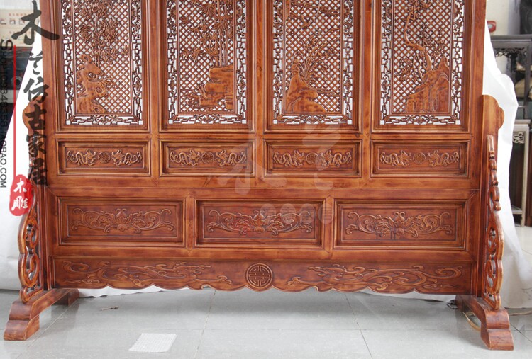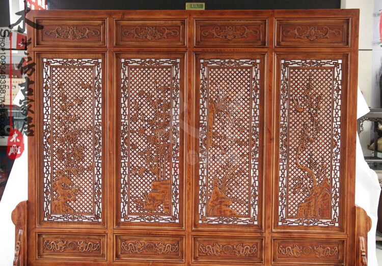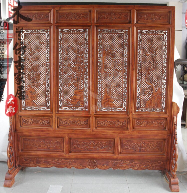 Dongyang wood carving hollow Melan bamboo daisy floor screen solid wood double - sided carving screen home furniture