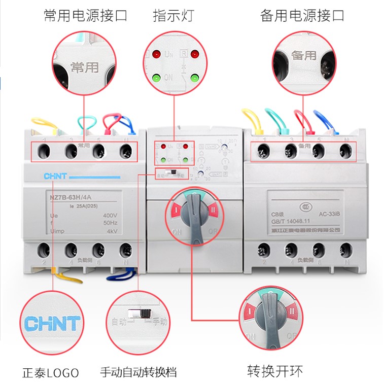 Zhengtai dual power supply automatic transfer switch NZ7B-63H 4 micro-break type 63A three-phase four-wire 40A switching switch