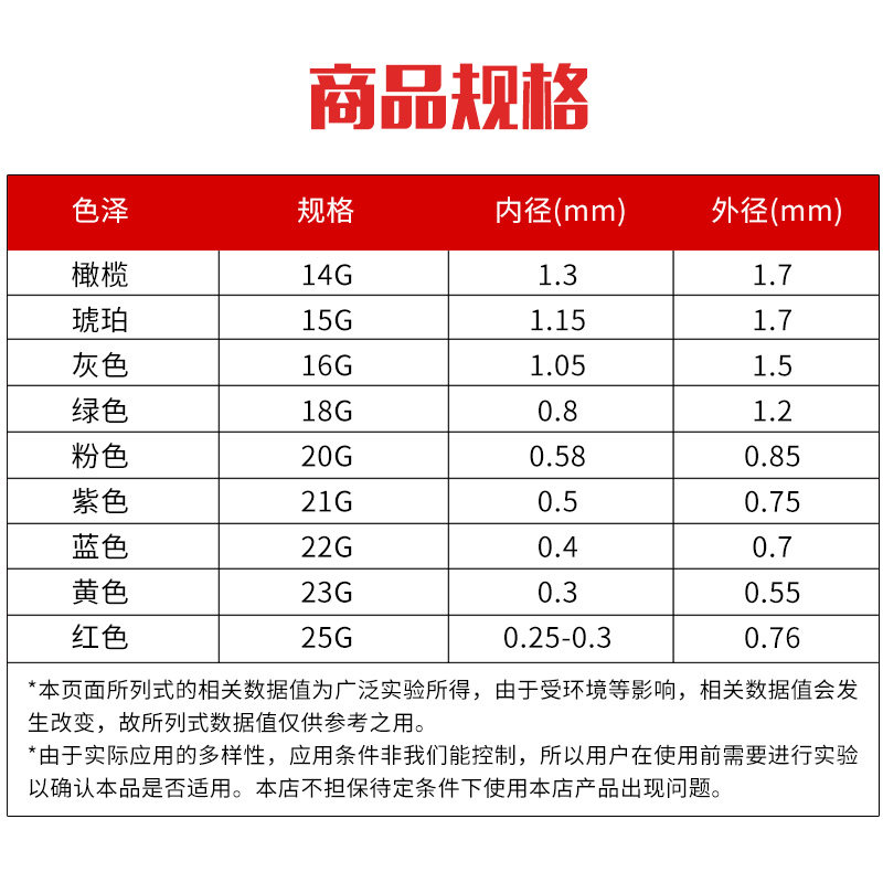 25G red PP half inch 22G blue PP half inch 21G purple PP half inch 20G pink PP half inch 18G green PP half inch 16G gray