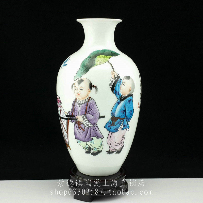 Jingdezhen porcelain hand-painted antique pastel children play picture "welcome spring" home decoration vase