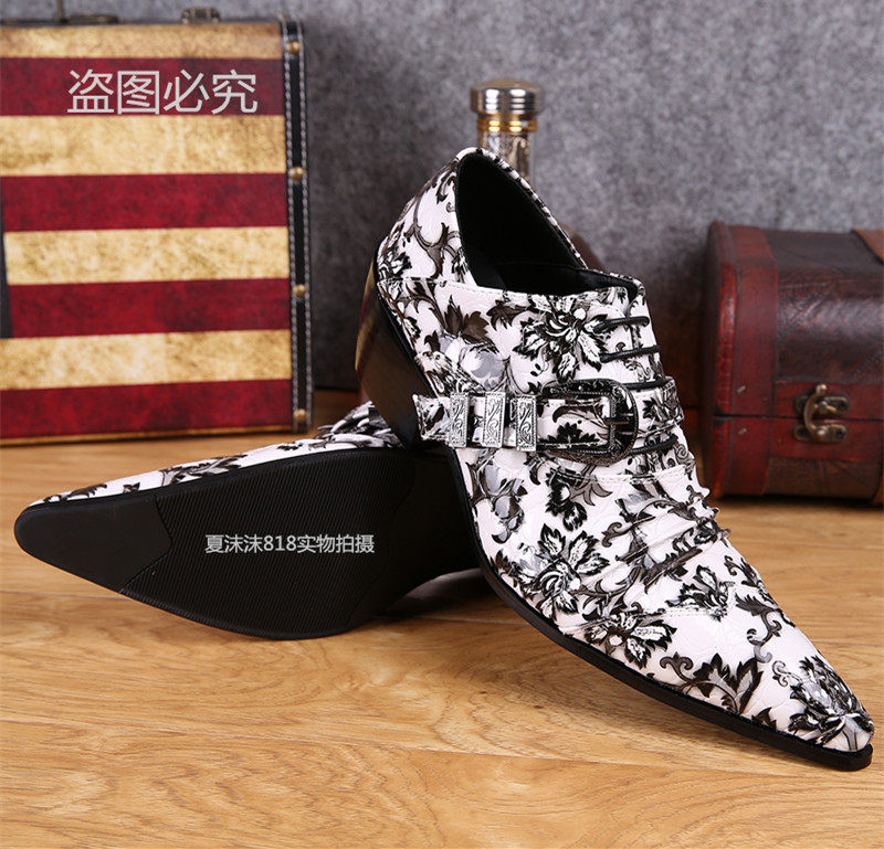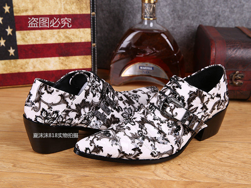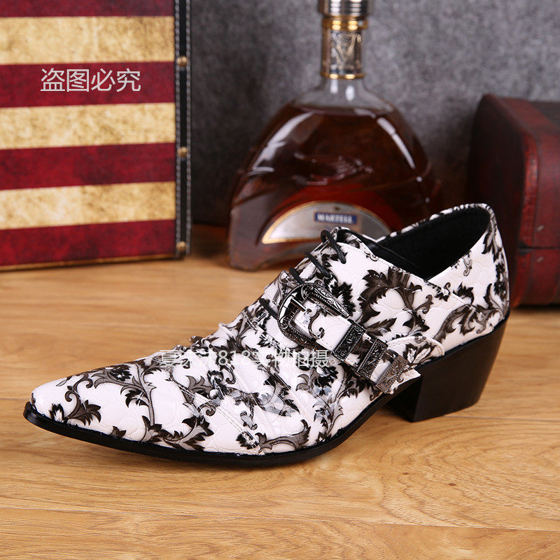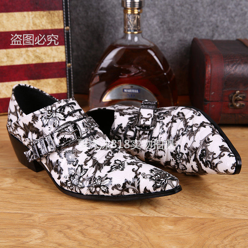 Trendy fashion youth leisuber shoes Han version Inren pointy inner heightening white printed men's single shoe hair stylist genuine leather shoes