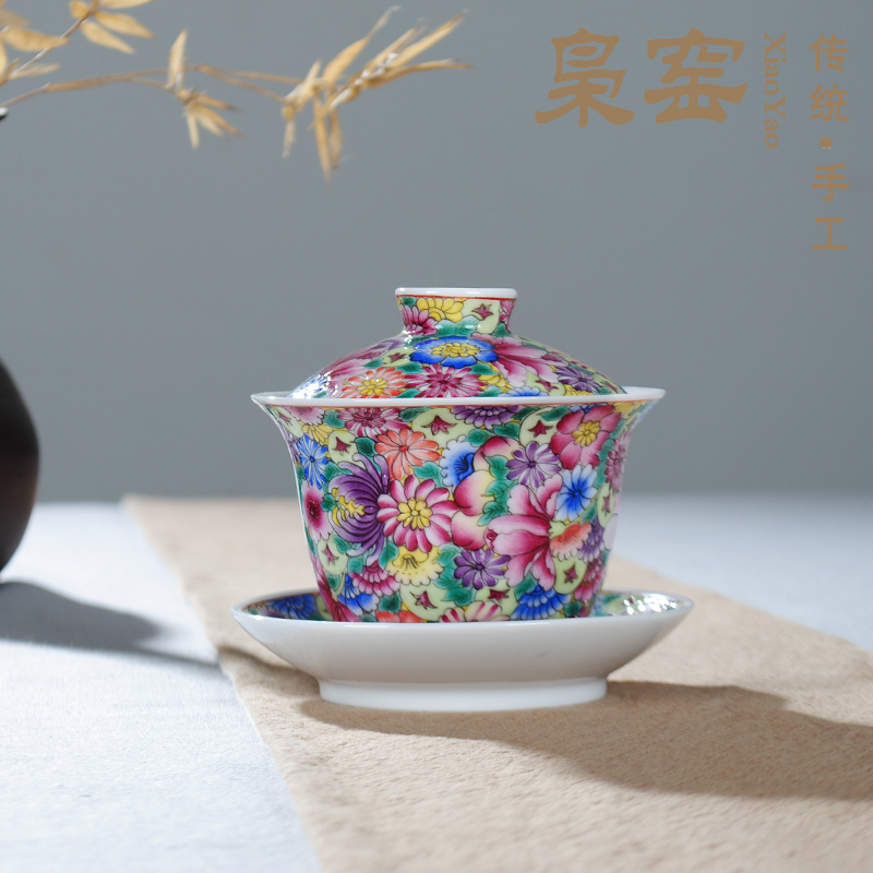 Jingdezhen Ceramic Cover Bowl Tea Set Hand Painted Enamel Colorful three-only Bowl Big hand imitation Gwan Flower Pink Pink Tea Cup