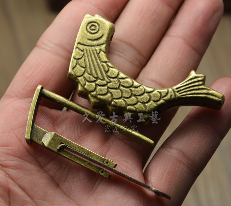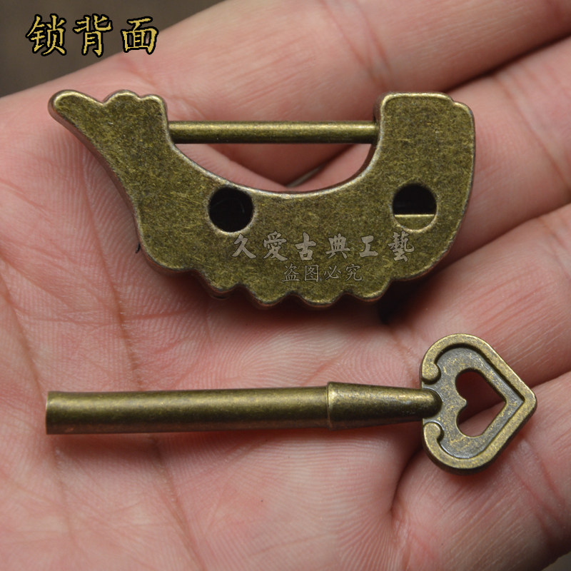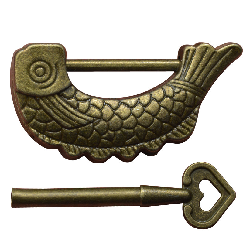 Chinese imitation antique lock zinc alloy small lock fish lock wooden case door transverse open padlock first decoration case retro key lock decoration lock