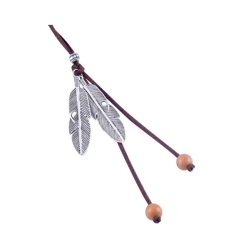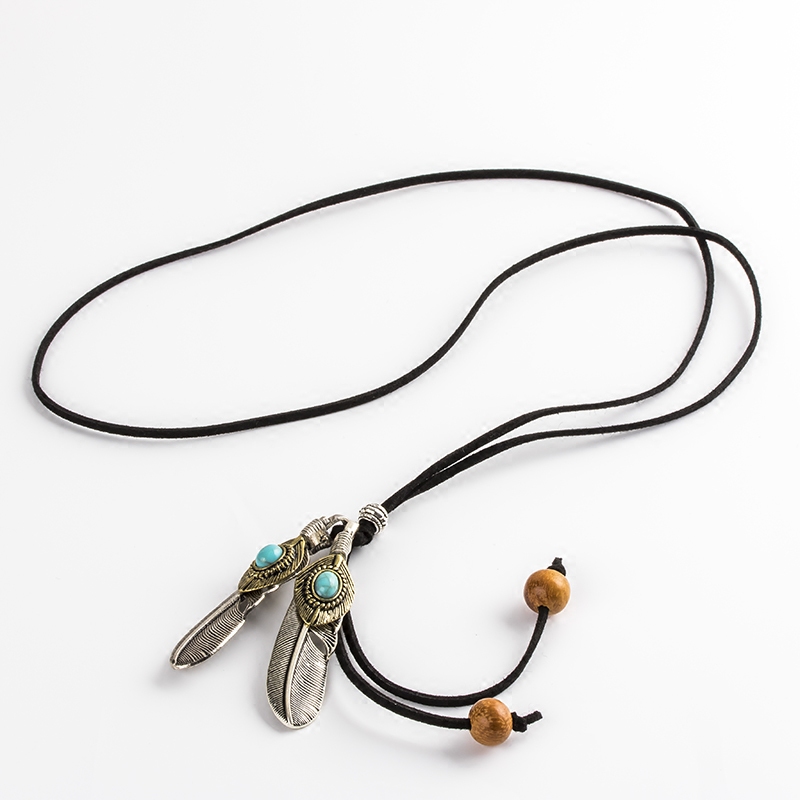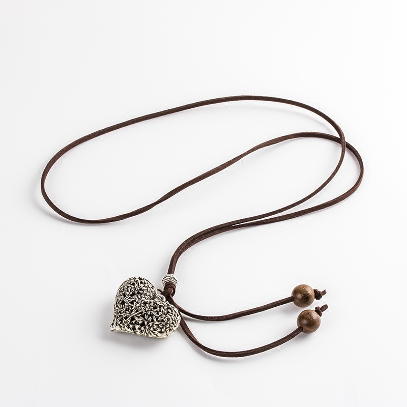 Vintage literary fan Cotton and hemp accessories Female long version necklace Alloy large feather heart-shaped pendant Suede rope sweater chain