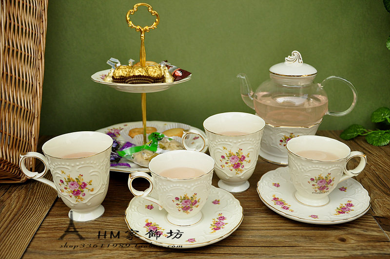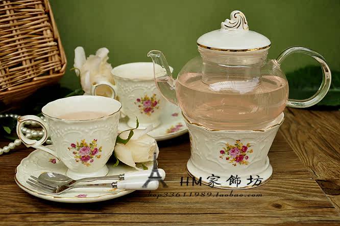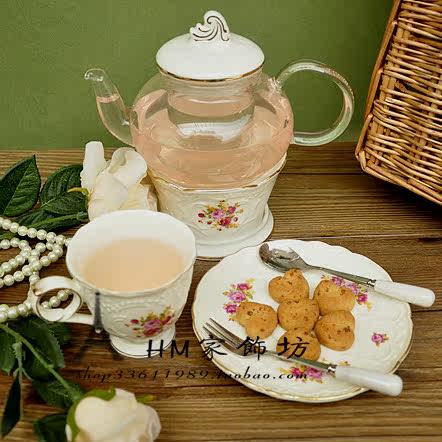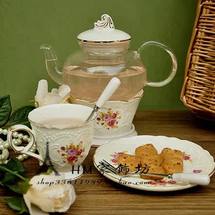 English flower fruit tea set set heat-resistant glass teapot ivory ceramic retro relief heater 2 cups saucer
